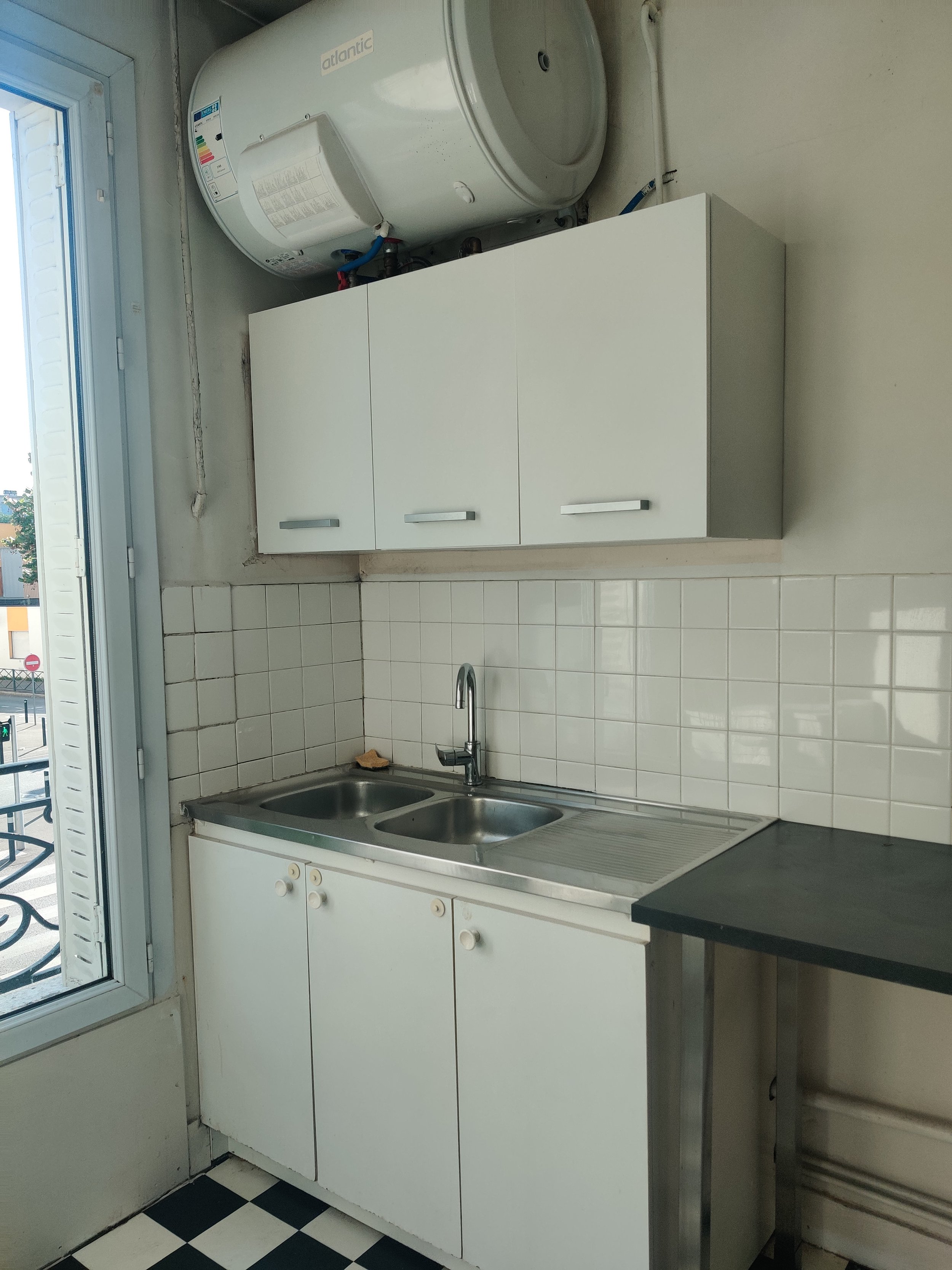 La cuisine a été entièrement repensée : suppression du lino existant, nouvelle dalle béton, carrelage damier, chauffe-eau neuf, création d’un petit bar et étagères sur mesure, électricité refaite complètement pour accueillir la nouvelle cuisine.