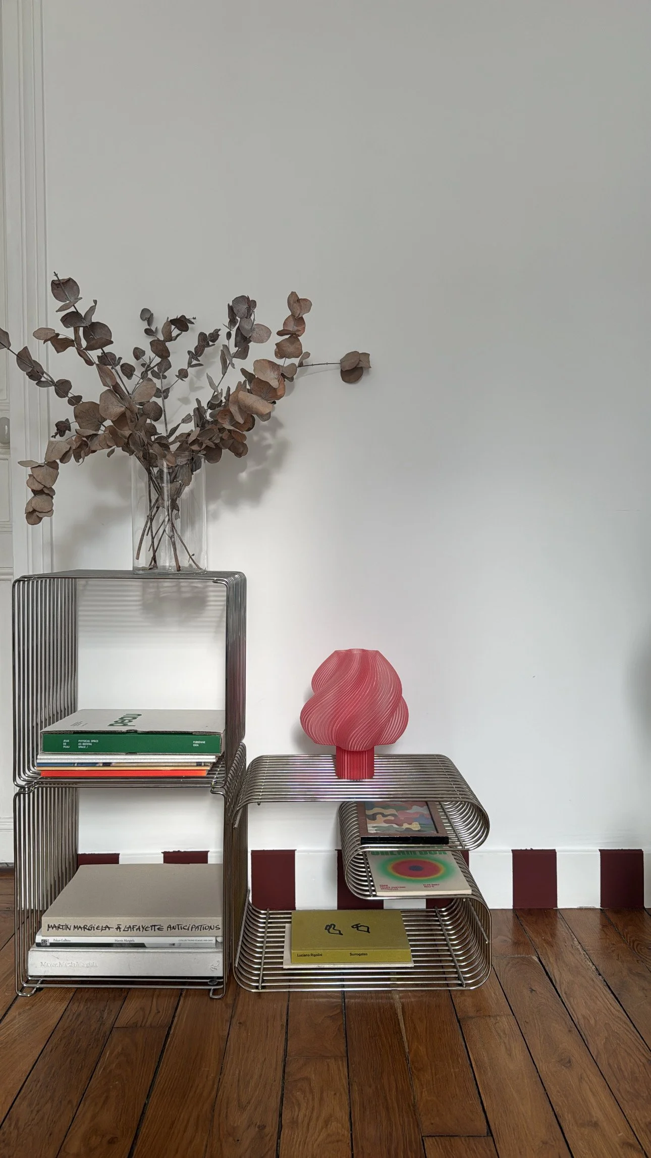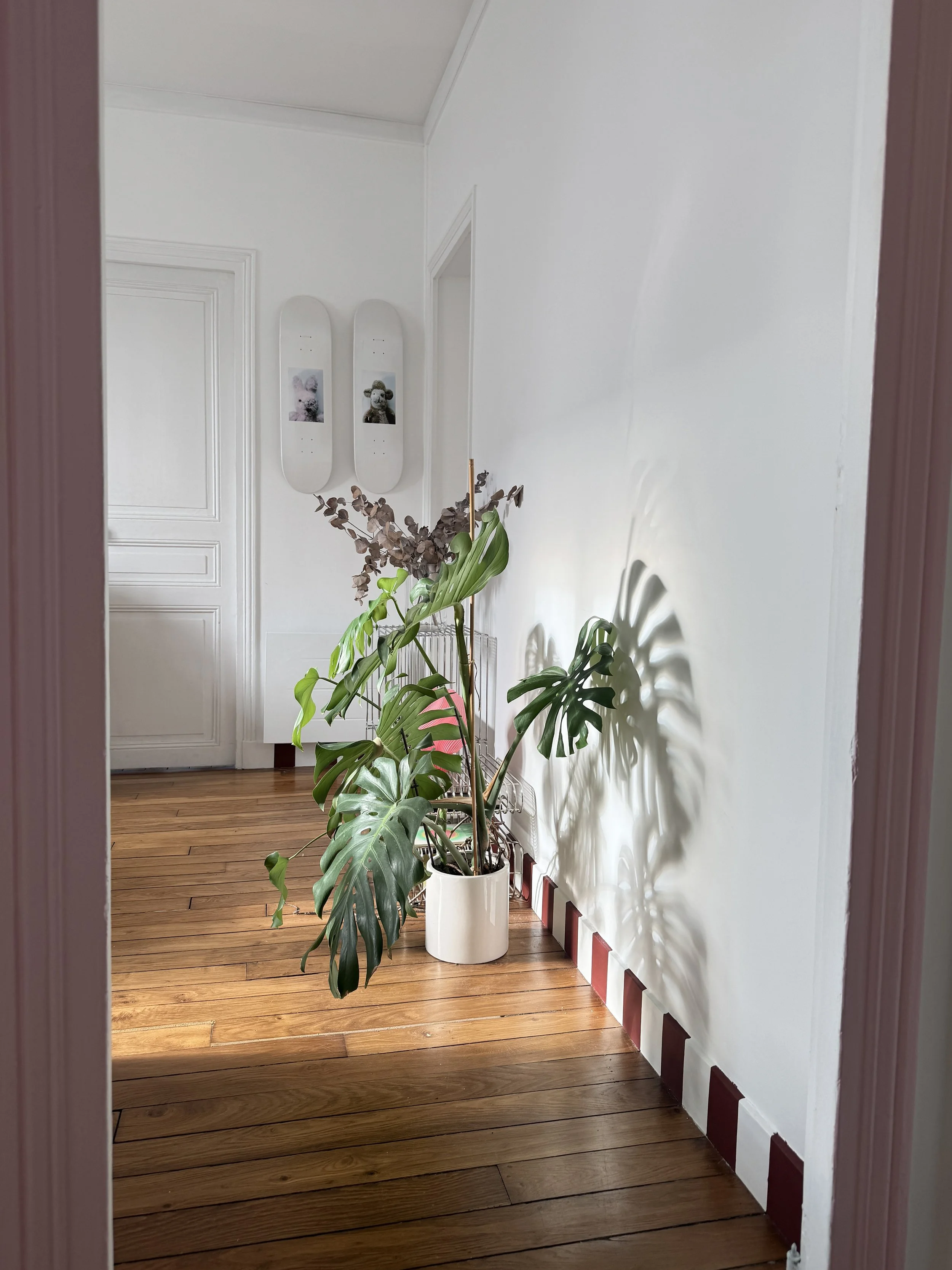 Création d’une entrée contemporaine, ouverte sur le salon, avec un accent de couleurs sur les tours de porte et plinthes.